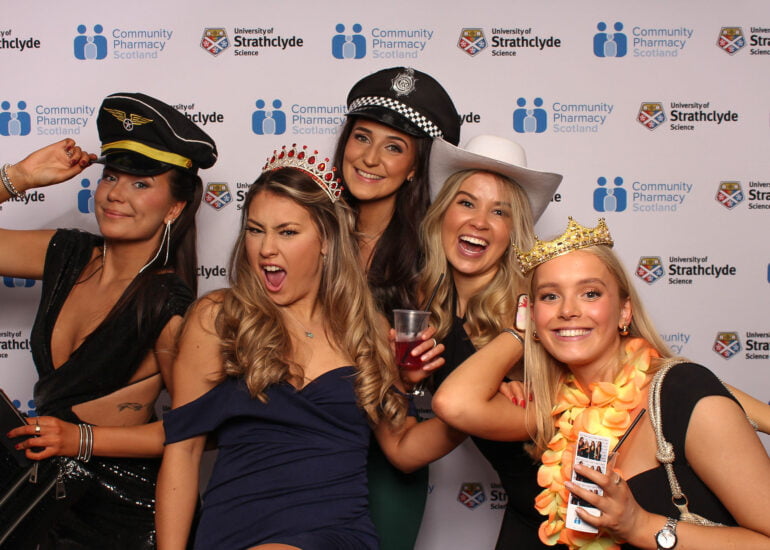Each photo strip was customized with the Strathclyde University Pharmacy Class of 2024 insignia, making them not just photos, but keepsakes. They were also provided with a custom printed backdrop with thier logos and branding.